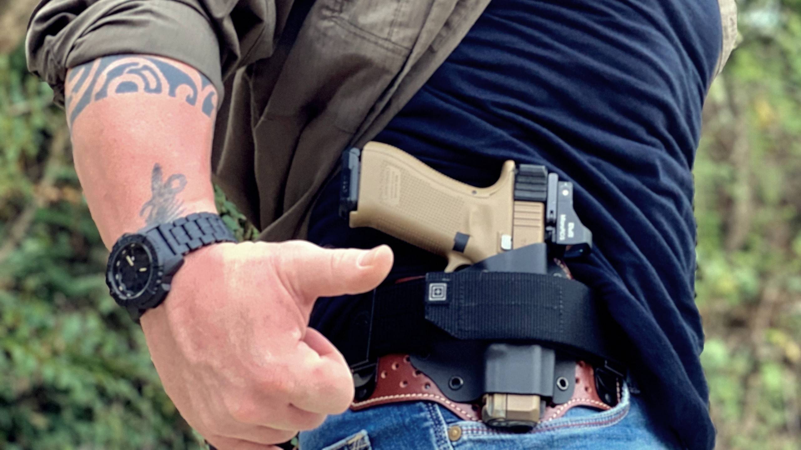 Bez puzdra – najčastejšie je tento typ nosia k videniu v Mexiku alebo Brazílii. Z môjho uhľa pohľadu však ide o najhoršiu možnú variantu nosenia zbrane a to hneď z niekoľkých dôvodov: