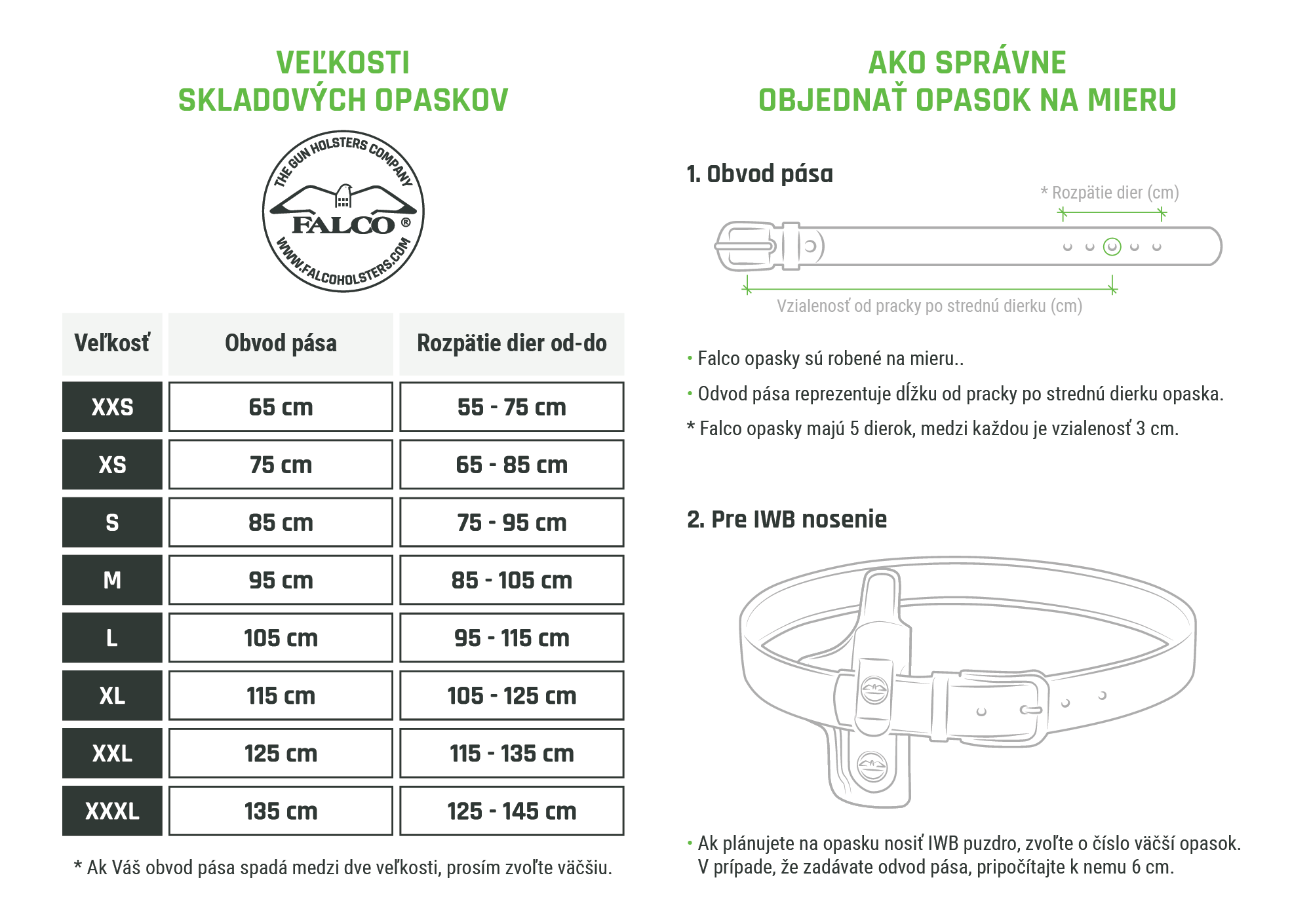 Vo FALCU vyrábame opasky presne na Váš obvod pásu. Každý opasok má 5 dierok, s rozostupom 3 centimetre. Pri jeho objednávaní si jednoducho vpíšete obvod Vášho pásu- pre nás to znamená dĺžku od pracky po strednú dierku na opasku.